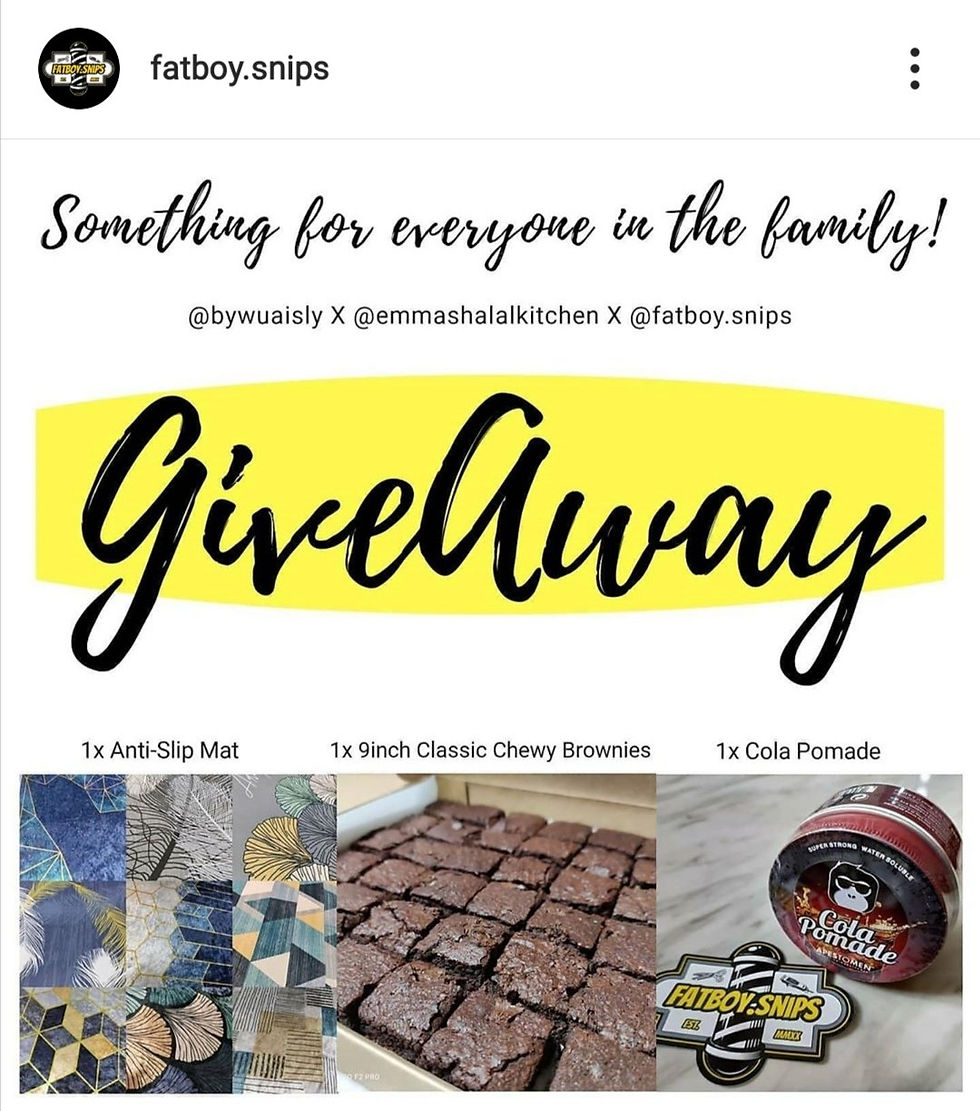 1. Shop Name: fatboy.Snips 2. Period: 14 aug 2020 3. Brief Description: GIVEAWAY TIME!! We are excited to be giving away not 1, not 2 but 3 ITEMS, suitable for a family unit! Why is that? And yes 2 lucky winners will get ALL of this! 2 sets to be given away. . @bywuaisly: One for the mummies! Choose any of 10 of the pretty Anti-Slip floormat to spice out your living space! (Worth $10) @fatboy.snips: One for the daddies to style yourself cool with the Cola Pomade! (Worth $15) @emmashalalkitchen: One for the kids & family! A whole slab of 36 pieces Classic Chewy Brownies! (Worth $30) OR 50Pcs of our classic #cuppachocchip! HOW TO WIN? FOLLOW these steps! 1. Follow/Like @emmashalalkitchen, @bywuaisly and @fatboy.snips on Instagram/Facebook 2. Tag 3 friends(or more!) who you think deserve to win as well! 3. Share this to your IGstory and tag us and get double the chance! Make sure your account is not private so we can see and repost 😍 . Contest ends this Friday 14 August and we will draw on the 14th August 2300hrs. Winners will be announced on the 15th and. Delivery will be on Sunday 16th August!